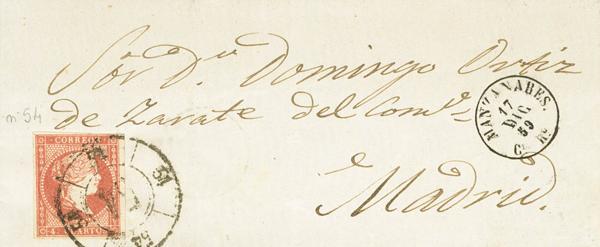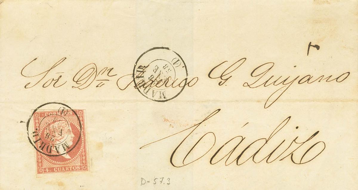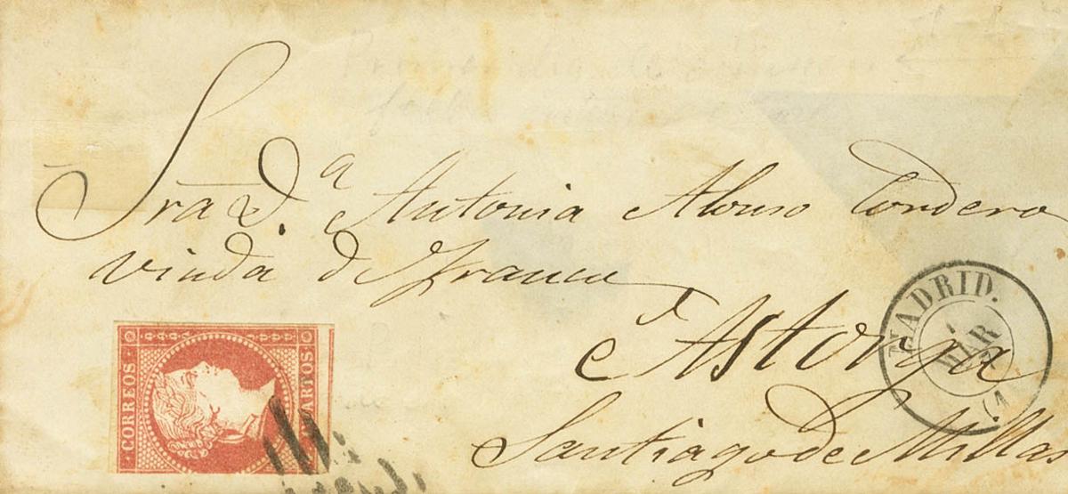 48. 1857. 4 cuartos rojo (margen izquierdo corto, sólo a tÃtulo informativo). MADRID a ASTORGA. En el frente fechador MADRID / 1-MAR-1857 / (1). MAGNIFICA Y RARISIMA, PRIMER DIA DE USO DE ESTE FECHADOR.