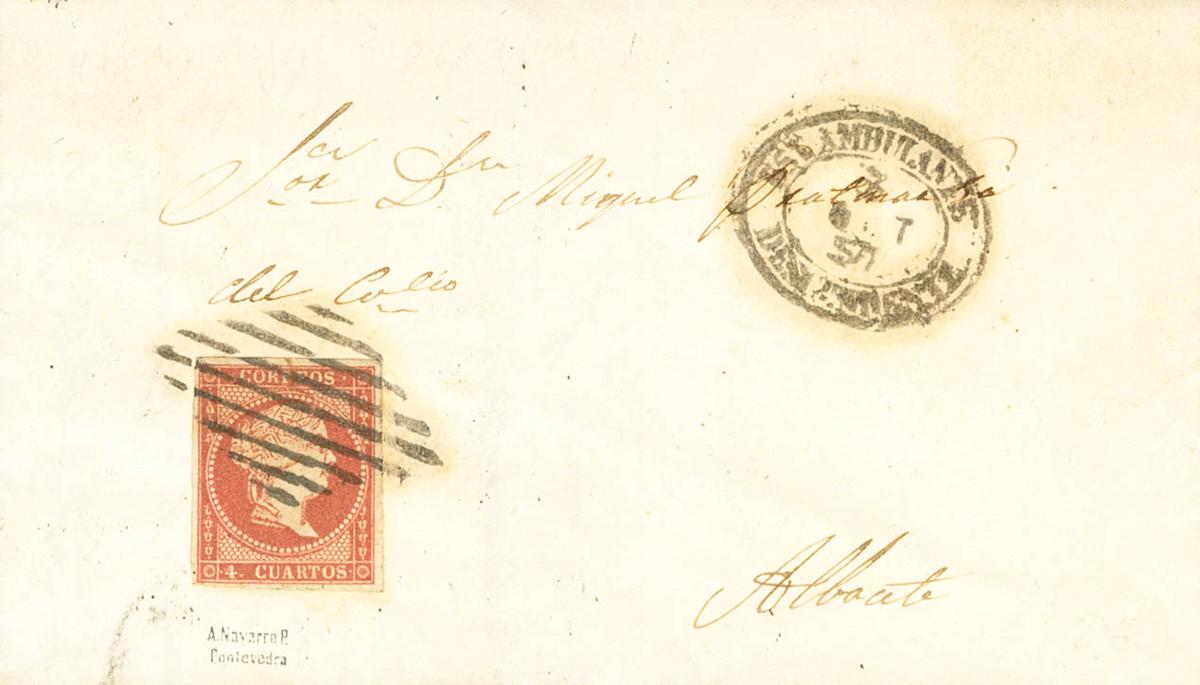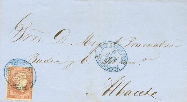 44. 1856. 4 cuartos rojo. Dirigida a ALBACETE. Matasello fechador ovalado EST.AMBULANTE / DESCENDENTE, en azul. MAGNIFICA Y MUY RARA.