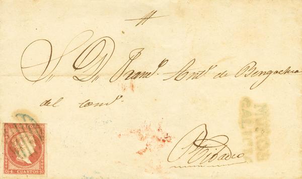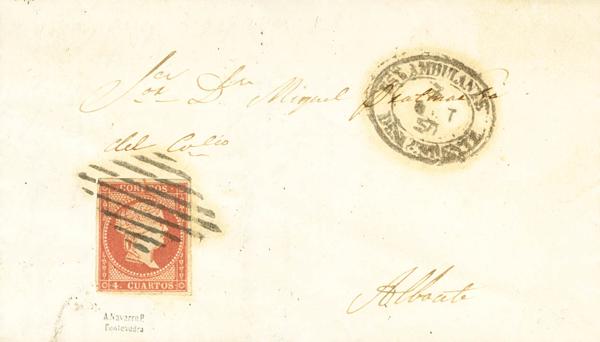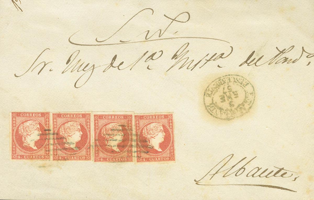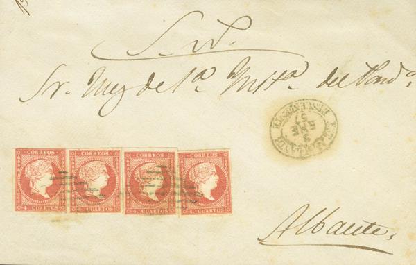 48. 1857. 4 cuartos rojo. MINAYA (ALBACETE) a ALBACETE. En el frente marca EST.AMBULANTE / DESCENDENTE. MAGNIFICA E INUSUAL.