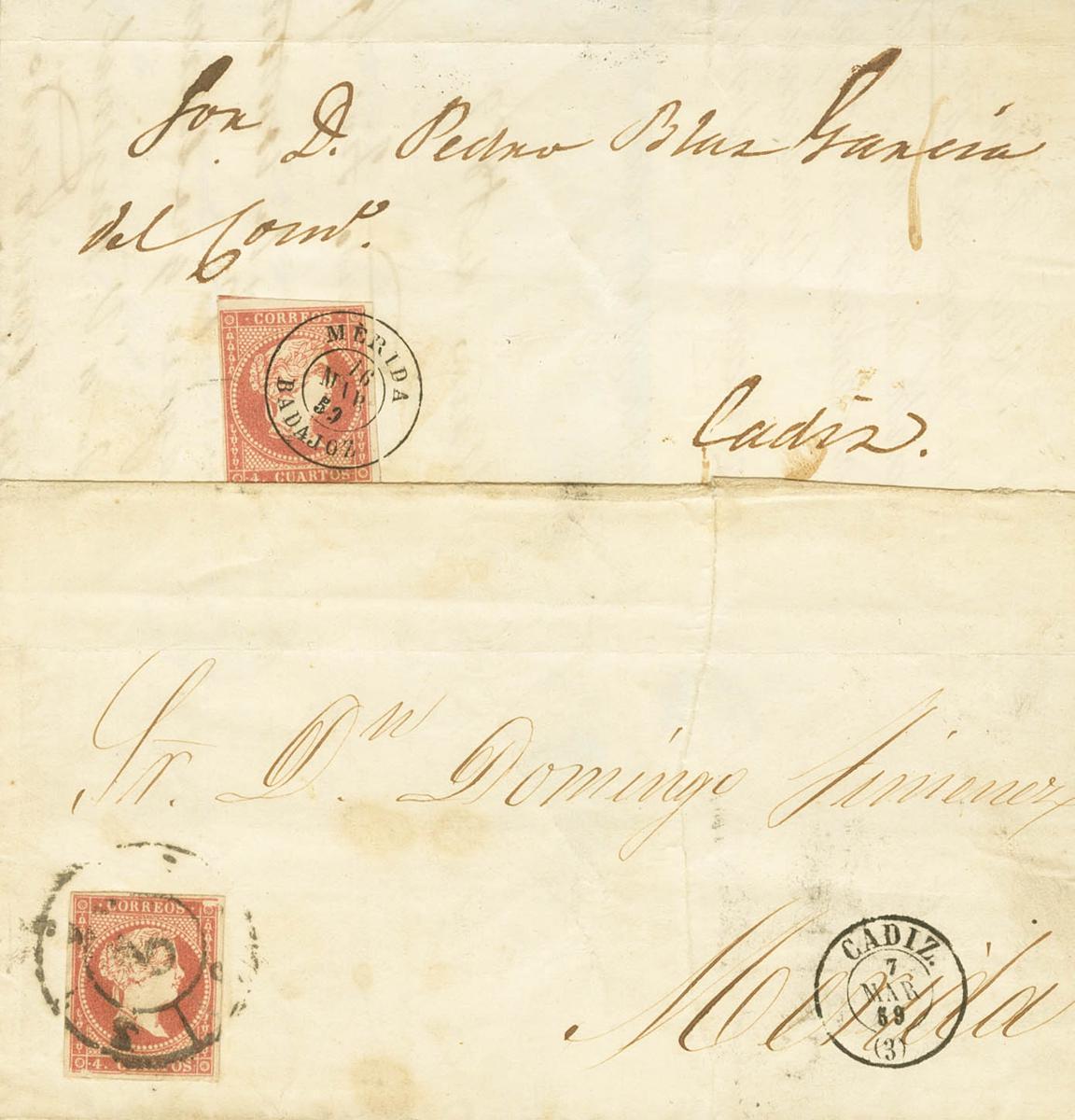 48. 1859. 4 cuartos rojo. CADIZ a MERIDA. Matasello R.CARRETA Nº3, reutilizada de vuelta aplicando otro sello de 4 cuartos de MERIDA a CADIZ e inutilizado con el matasello fechador MERIDA / BADAJOZ. MAGNIFICA Y RARA.