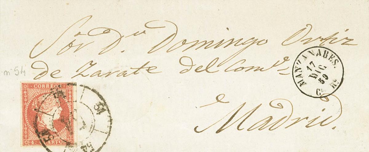 48. 1859. 4 cuartos rojo. ISLAS BALEARES (dato no confirmado) a MADRID. Al dorso marca MESSAGERIES IMPERIALES / SERVICES MARITIMES, esta empresa con delegación en Alicante recortaba en dos o tres dÃas el tránsito entre Baleares y Madrid, la correspondencia se redirigÃa privadamente hasta Alicante desde Mallorca y allà la depositaban en el ambulante. MAGNIFICA Y RARA.