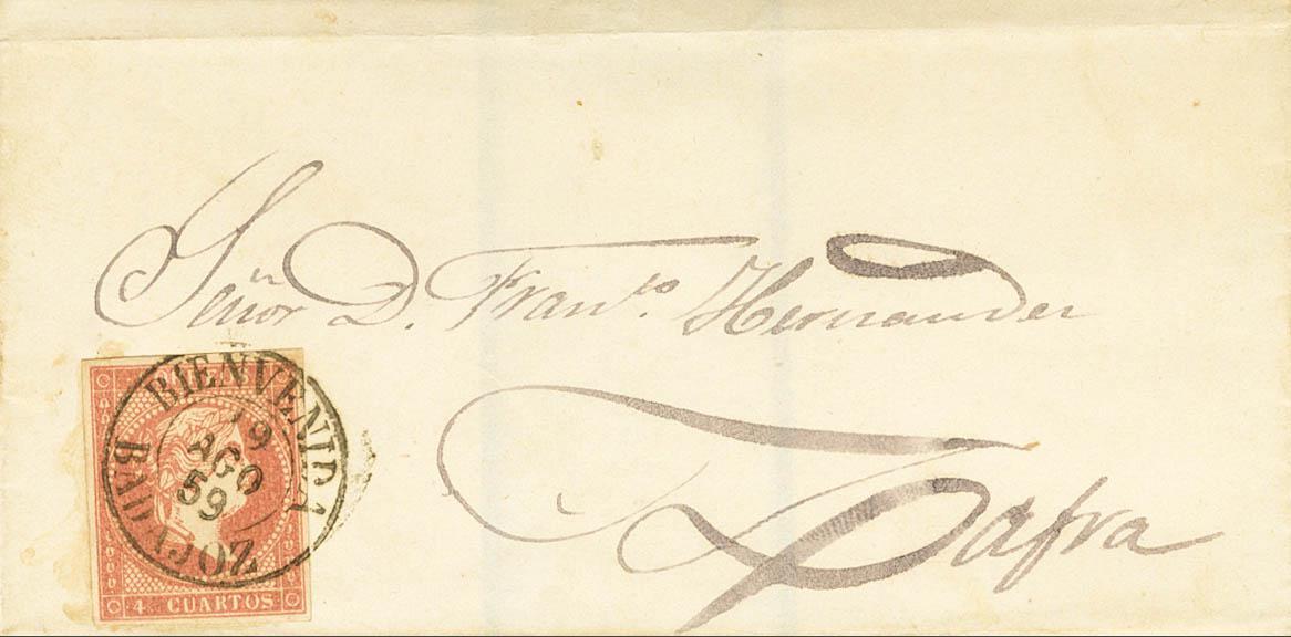 48. 1859. 4 cuartos rojo. BIENVENIDA a ZAFRA. Matasello BIENVENIDA / BADAJOZ (Tipo I). MAGNIFICA Y ESPECTACULAR ESTAMPACION.