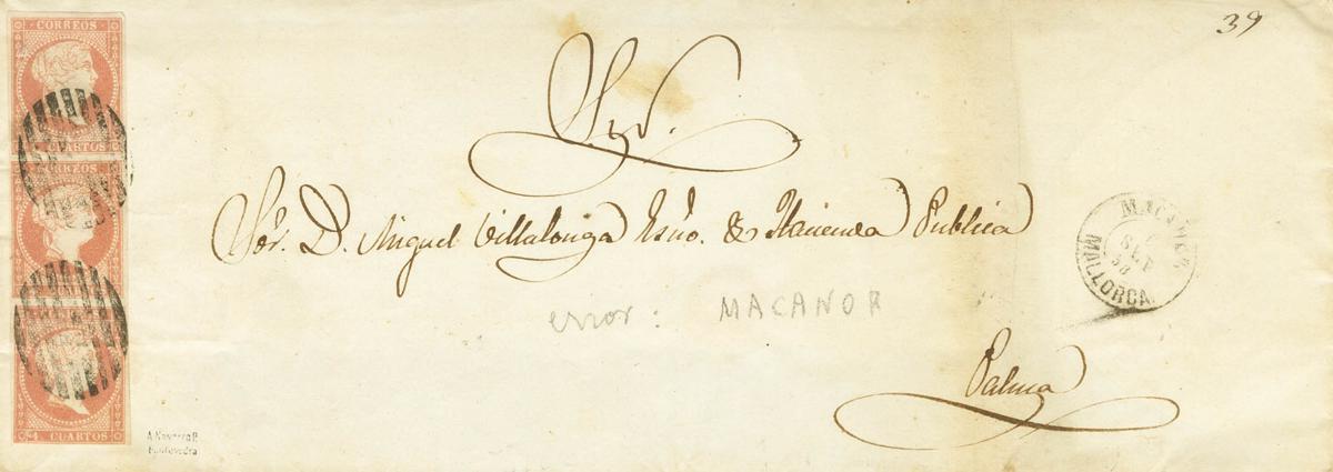 48(3). 1858. 4 cuartos rojo, tira de tres. MANACOR a PALMA. Matasello PARRILLA DE BALEARES y en el frente fechador con el "error" MACANOR / MALLORCA. MAGNIFICA Y RARA.