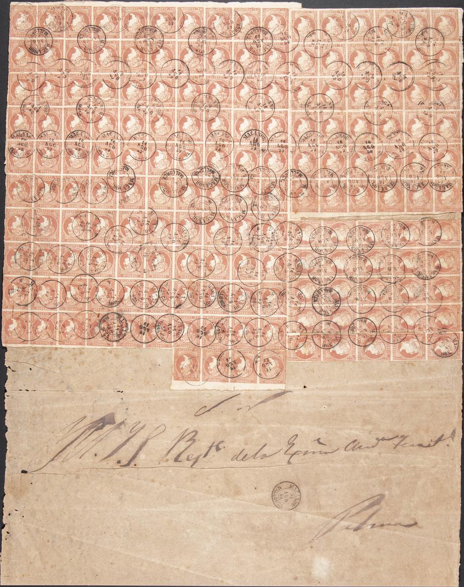 48(165). 1859. 4 cuartos rojo, ciento sesenta y cinco sellos. Plica Judicial de MANACOR a PALMA DE MALLORCA. Matasello MACANOR / MALLORCA. MAGNIFICA Y MAYOR FRANQUEO CONOCIDO DEL 4 CUARTOS ROJO HASTA LA FECHA, PIEZA DE ENORME IMPORTANCIA.