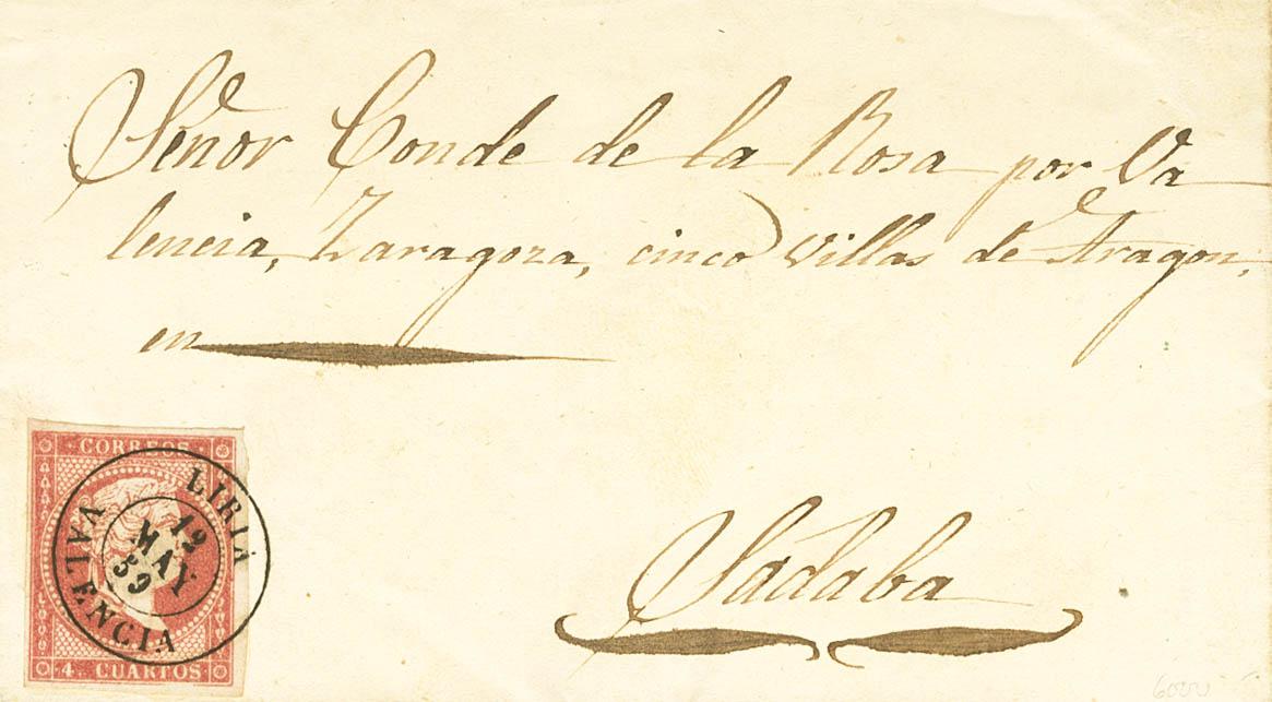 48. 1859. 4 cuartos rojo. LIRIA (VALENCIA) a SADABA (ZARAGOZA). Matasello LIRIA / VALENCIA. MAGNIFICA Y RARA.