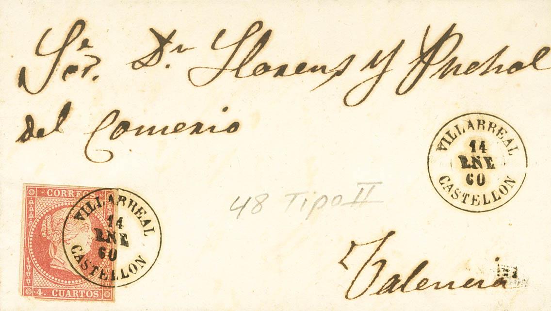 48. 1858. 4 cuartos rojo. VILLAREAL a VALENCIA. Matasello VILLAREAL / CASTELLON (Tipo I). MAGNIFICA Y RARA.