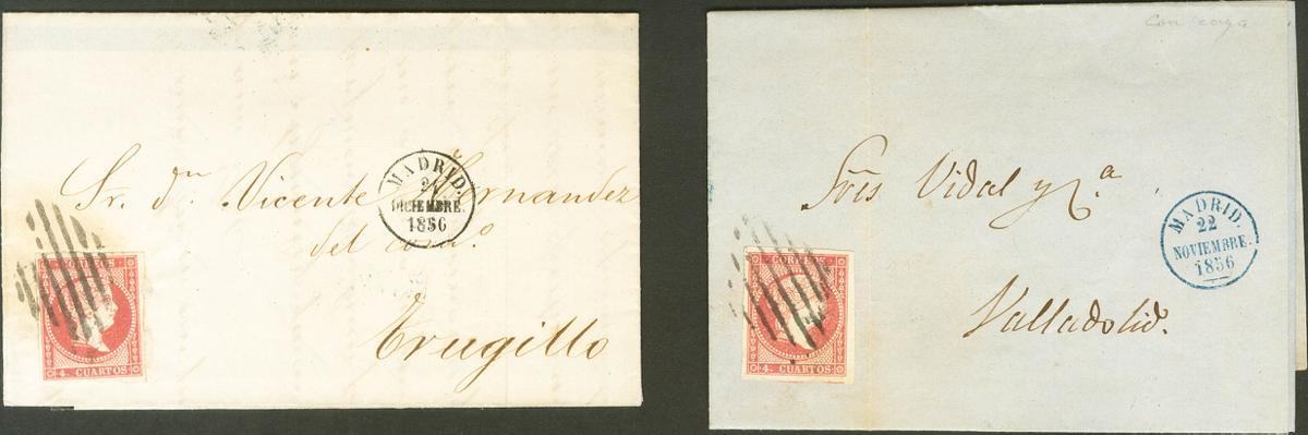 1854. Conjunto de dos cartas circuladas con el 4 cuartos rojo, ambas con origen en MADRID y destino TRUJILLO y VALLADOLID, respectivamente, las dos carta en el frente fechador especial MADRID (Tipo pequeño y con la variante con punto después de Madrid, ambos reseñados en la obra de Sitjá), en color negro y azul (el color en azul presenta lÃnea horizontal), respectivamente. MAGNIFICAS.