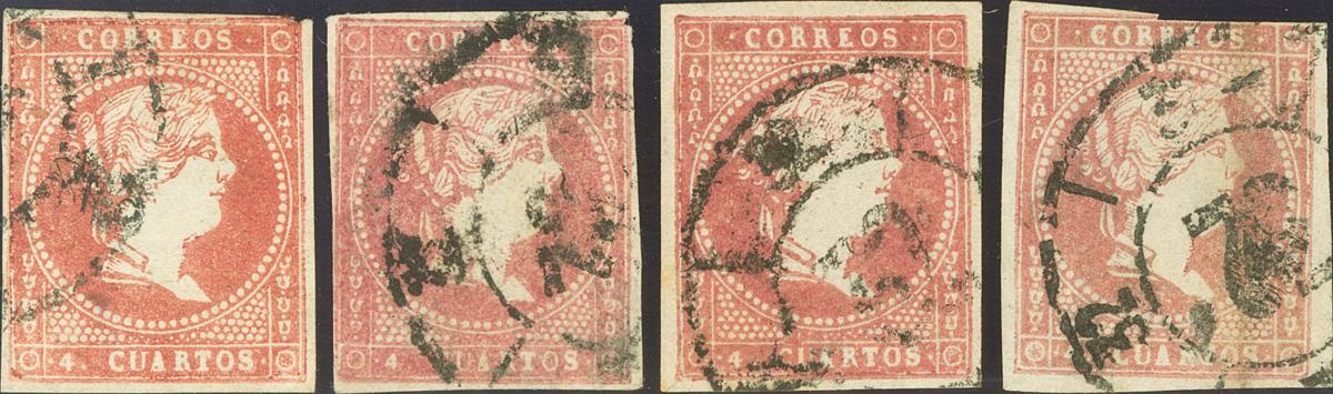 48F(4). 1856. Precioso conjunto de cuatro sellos del 4 cuartos rojo FALSO POSTAL TIPO V inutilizados, como es habitual con la R.CARRETA Nº32, de Lérida. MAGNIFICO CONJUNTO.