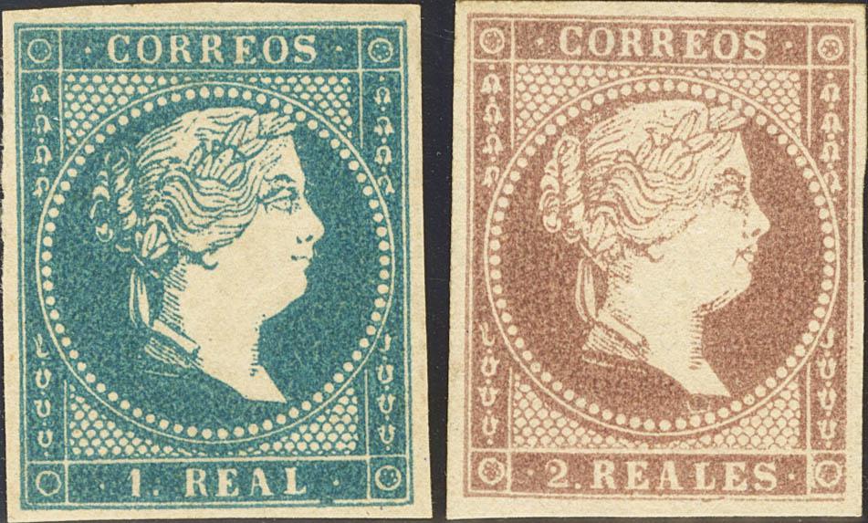 ★ 49, 50. 1855. 1 real azul y 2 reales violeta. MAGNIFICOS.