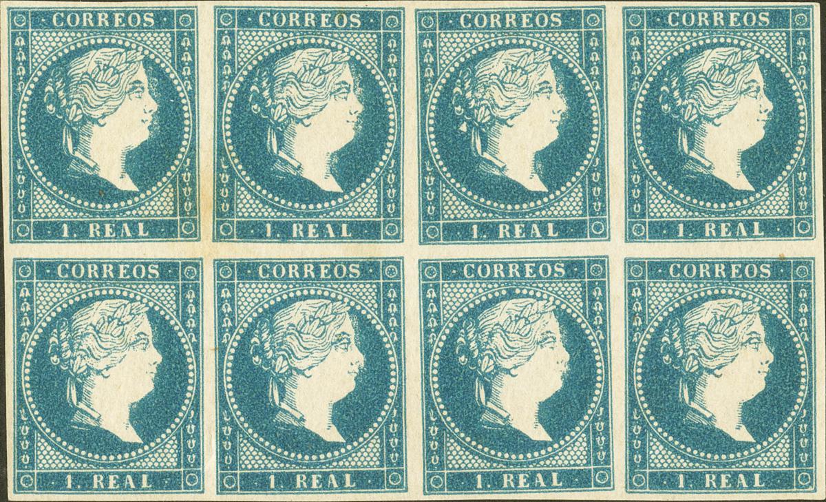 ★★/★ 49(8). 1855. 1 real azul, bloque de ocho. MAGNIFICO.