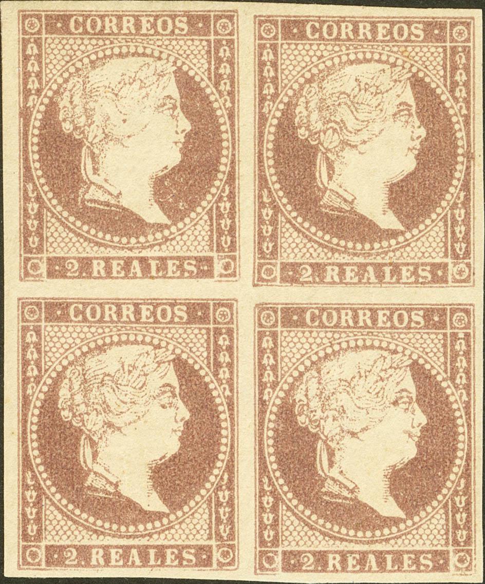 ★ 50(4). 1855. 2 reales violeta, bloque de cuatro. MAGNIFICO. Edifil 2020: ++385 Euros