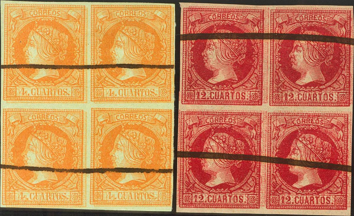 52ed(4), 53ed(4). 1860. 4 cuartos naranja y 12 cuartos carmÃn, bloques de cuatro. DOBLE IMPRESION e inutilizados con raya de tinta. MAGNIFICOS. Cert. CEM. Edifil 2020: +536 Euros