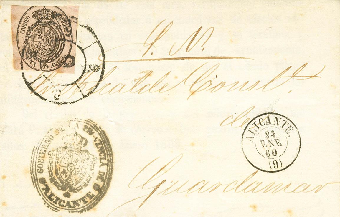 36. 1860. (20 de Enero). 1 onza negro y rosa. ALICANTE a GUARDAMAR DEL SEGURA (ALICANTE). Matasello R.CARRETA Nº9, de Alicante. MAGNIFICA E INTERESANTISIMO DOCUMENTO DE LA ENTREGA DE SELLOS PARA CORRESPONDENCIA, EN ESTE CASO SE TRATA DE LA EMISION DE 1860 CUYO PRIMER DIA DE EMISION ES EL 1 DE FEBRERO.
