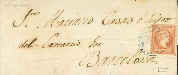 48. 1859. 4 cuartos rojo. ONTANEDA (CANTABRIA) a BARCELONA. Matasello ONTANEDA / PROVª DE / SANTANDER, en azul. MAGNIFICA Y RARA.