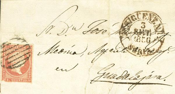 48. 1856. 4 cuartos rojo. EL ATANCE (GUADALAJARA) a GUADALAJARA (roturas en el frente). En el frente baeza SIGÜENZA / SORIA, en tinta de escribir. BONITA Y RARO USO TARDIO DEL FECHADOR TIPO BAEZA.