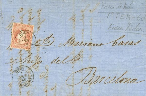 48. 1860. (1 de Febrero). 4 cuartos rojo. REUS (TARRAGONA) a BARCELONA. Matasello REUS / 1-FEB-60 / TARRAGONA. MAGNIFICA E INUSUAL CARTA CIRCULADA COINCIDIENDO CON EL PRIMER DIA DE USO DE LA SIGUIENTE EMISION Y DENTRO DEL PERIODO DE VALIDEZ MIXTO DE LAS DOS EMISIONES QUE SE ALARGA HASTA EL 15 DE FEBRERO.