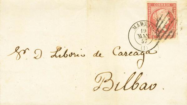 48. 1857. 4 cuartos rojo. MADRID a BILBAO. Matasello mixto REJILLA y fechador modificado MADRID / (1). MAGNIFICA Y RARA.