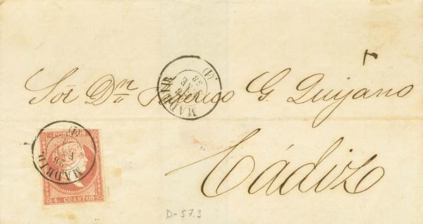 48. 1858. 4 cuartos rojo. MADRID a CADIZ. Matasello fechador modificado MADRID / (1). MAGNIFICA Y RARISIMA.