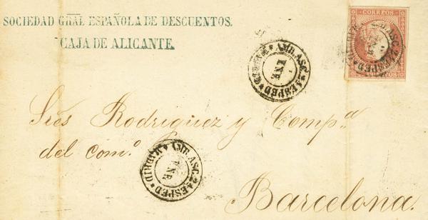 48. 1859. 4 cuartos rojo. ALCANTARA a BARCELONA. Matasello ALCANTARA / CACERES (Tipo I). MAGNIFICA Y RARA, ESPECIALMENTE CON ESTA ESPECTACULAR ESTAMPACION.