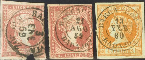 48(2), 52. 1855. 4 cuartos rojo, dos sellos (uno con defecto y del Tipo I) y 4 cuartos naranja. Matasellos BARCARROTA / BADAJOZ (uno de Tipo I). BONITOS.
