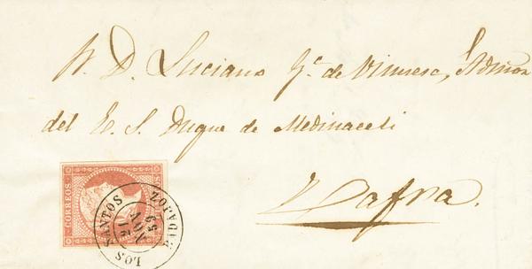 48. 1859. SANTA MARTA DE LOS BARROS a ZAFRA. Matasello LOS SANTOS / BADAJOZ. MAGNIFICA Y ESPECTACULAR ESTAMPACION Y MUY RARA.