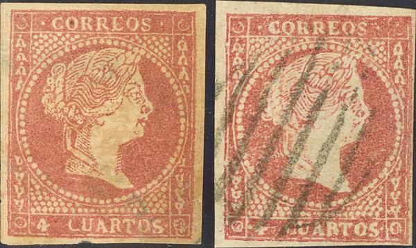 ★/ 48F(2). 1856. 4 cuartos rojo FALSO POSTAL TIPO IV, en nuevo y usado. MAGNIFICOS.