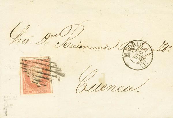 48F. 1859. 4 cuartos rojo FALSO POSTAL TIPO XIII. MADRID a CUENCA. MAGNIFICA.