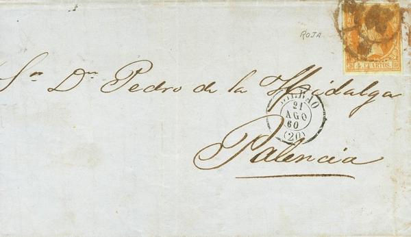 52. 1860. 4 cuartos naranja. BILBAO a PALENCIA. Matasello R.CARRETA Nº20, de Bilbao. MAGNIFICA Y RARISIMA EN ESTA ESPECTACULAR CALIDAD, SIN DUDA UNA DE LAS MEJORES CONOCIDAS.