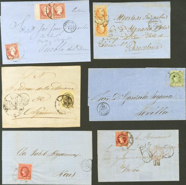 (1855ca). Interesante conjunto de cinco cartas y un frontal franqueados con sellos de diferentes emisiones de Isabel II con matasello R.CARRETA Nº7, de Sevilla. A EXAMINAR.