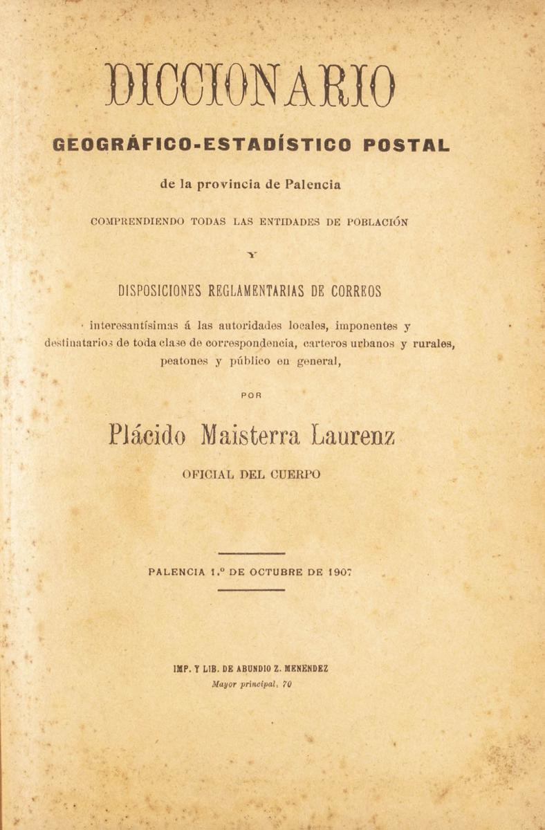 1907. DICCIONARIO GEOGRAFICO-ESTADISTICO POSTAL DE LA PROVINCIA DE PALENCIA. Plácido Maisterra Laurenz. Palencia, 1907. (encuadernado).