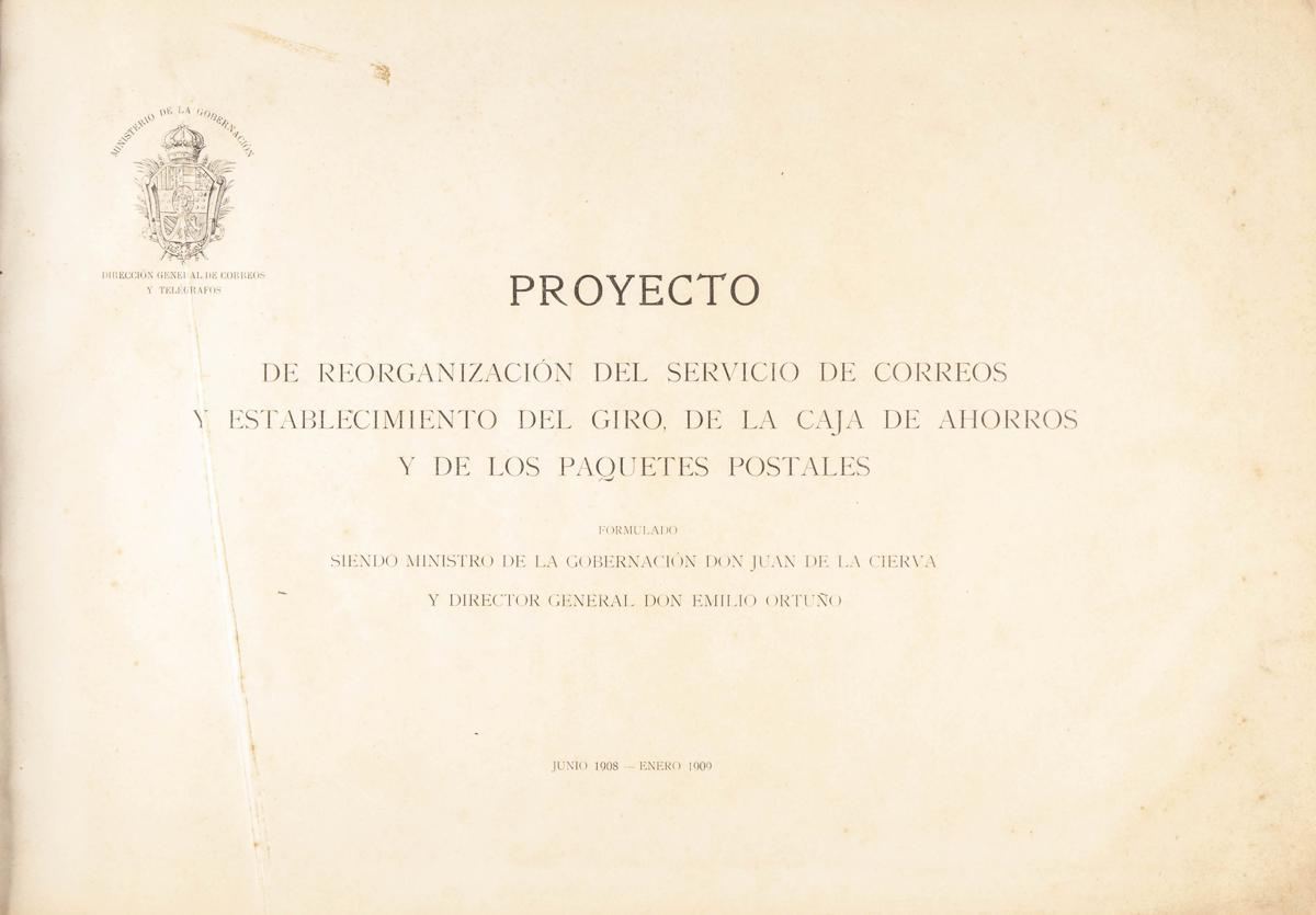 1908. PROYECTO DE REORGANIZACION DEL SERVICIO DE CORREOS Y ESTABLECIMIENTO DEL GIRO DE LA CAJA DE AHORROS Y DE LOS PAQUETES POSTALES. Ministerio de la Gobernación, Dirección General de Correos y Telégrafos. Madrid, 1908. (ejemplar fatigado, especialmente en la encuadernación, ideal para una moderna encuadernación elegante, contiene innumerables mapas, cuadros, etc)
