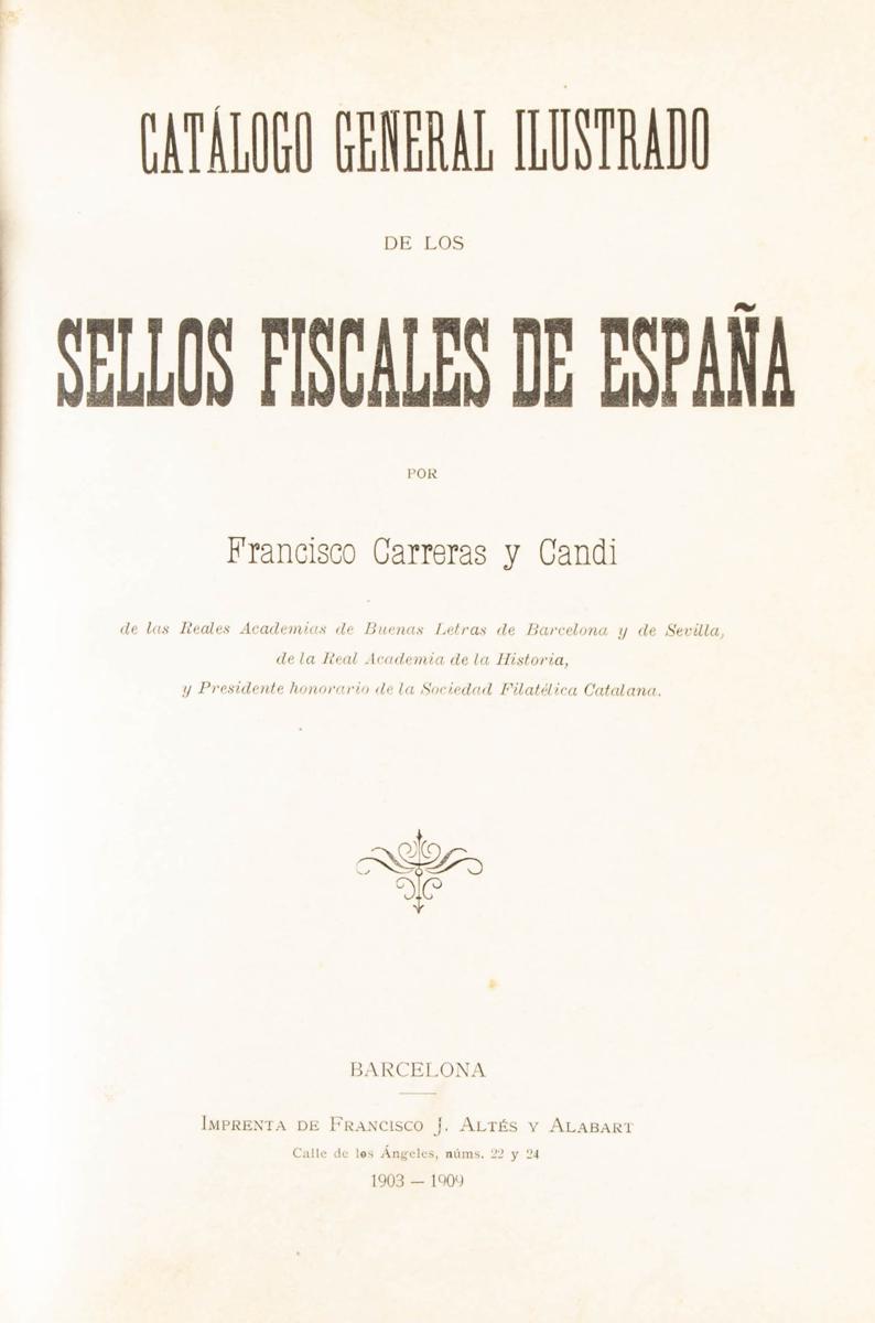 1909. CATALOGO GENERAL DE LOS SELLOS FISCALES DE ESPAÑA. Francisco Carreras y Candi. Barcelona, 1909.