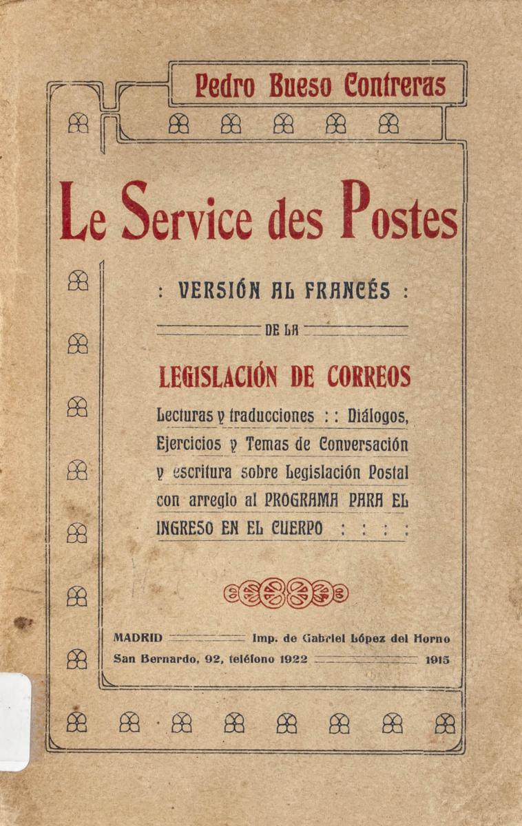 1915. LE SERVICE DES POSTES, VERSION AL FRANCES DE LA LEGISLACION DE CORREOS. Pedro Bueso Contreras. Servicio de Correos. Madrid, 1915.