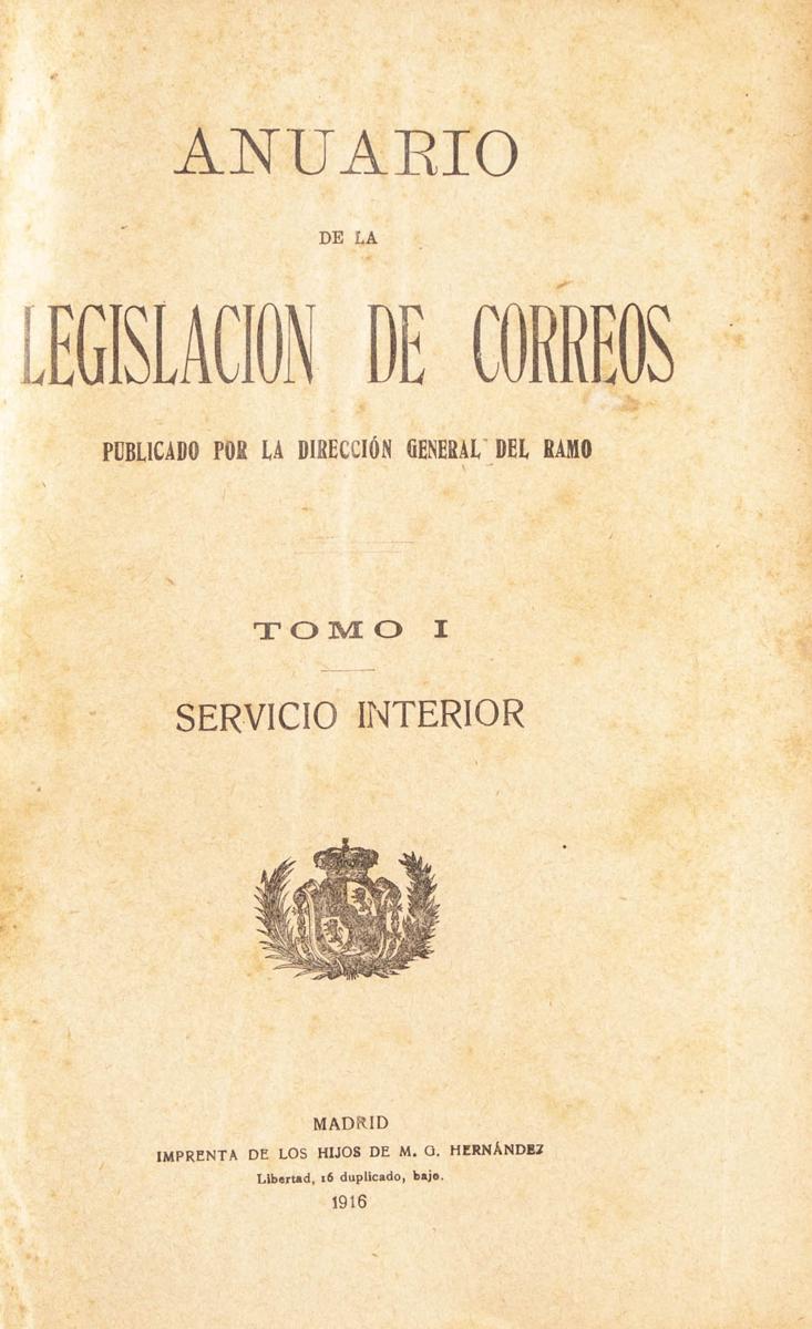 1916. ANUARIO DE LA LEGISLACION DE CORREOS, tomo I. Dirección General de Correos. Madrid, 1916. (con anotaciones manuscritas de actualizaciones posteriores a su edición)