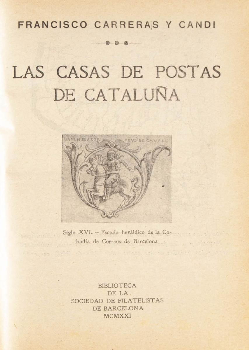 1921. LAS CASAS DE POSTAS DE CATALUÑA. Francisco Carreras y Candi. Biblioteca de la Sociedad de Filatelistas de Barcelona. Barcelona, 1921. (encuadernado)
