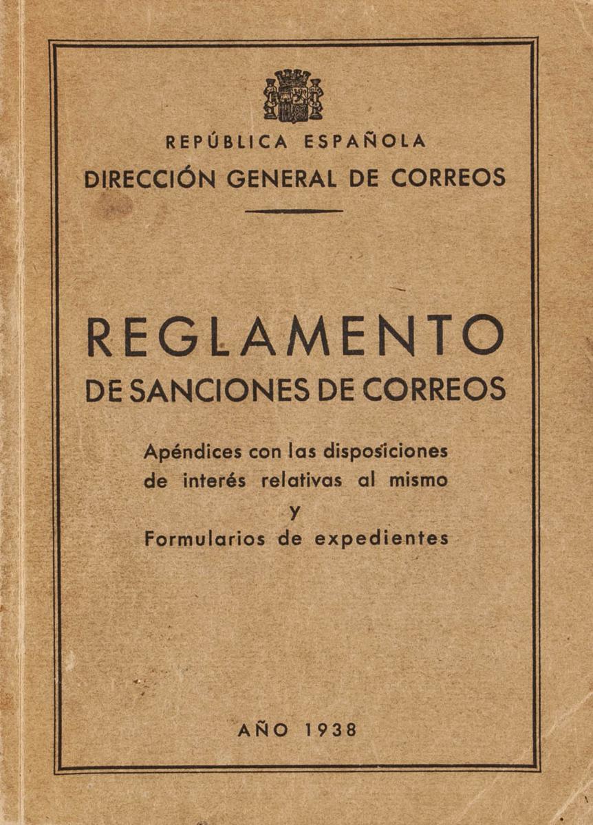 1938. REGLAMENTO DE SANCIONES DE CORREOS, APENDICES CON LAS DISPOSICIONES DE INTERES RELATIVAS AL MISMO Y FORMULARIOS DE EXPEDIENTES. Dirección General de Correos. Barcelona, 1938.