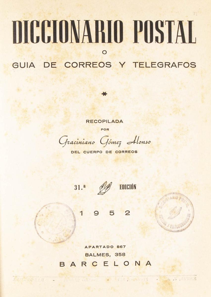 1952. DICCIONARIO POSTAL, TARIFAS DE LOS SERVICIOS NACIONALES DE CORREOS Y TELECOMUNICACION, 31ª edición. Graciniano Gómez Alonso. Barcelona, 1952.