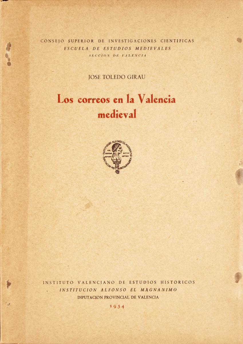 1954. LOS CORREOS EN LA VALENCIA MEDIEVAL. José Toledo Girau. Diputación Provincial de Valencia. Valencia, 1954.