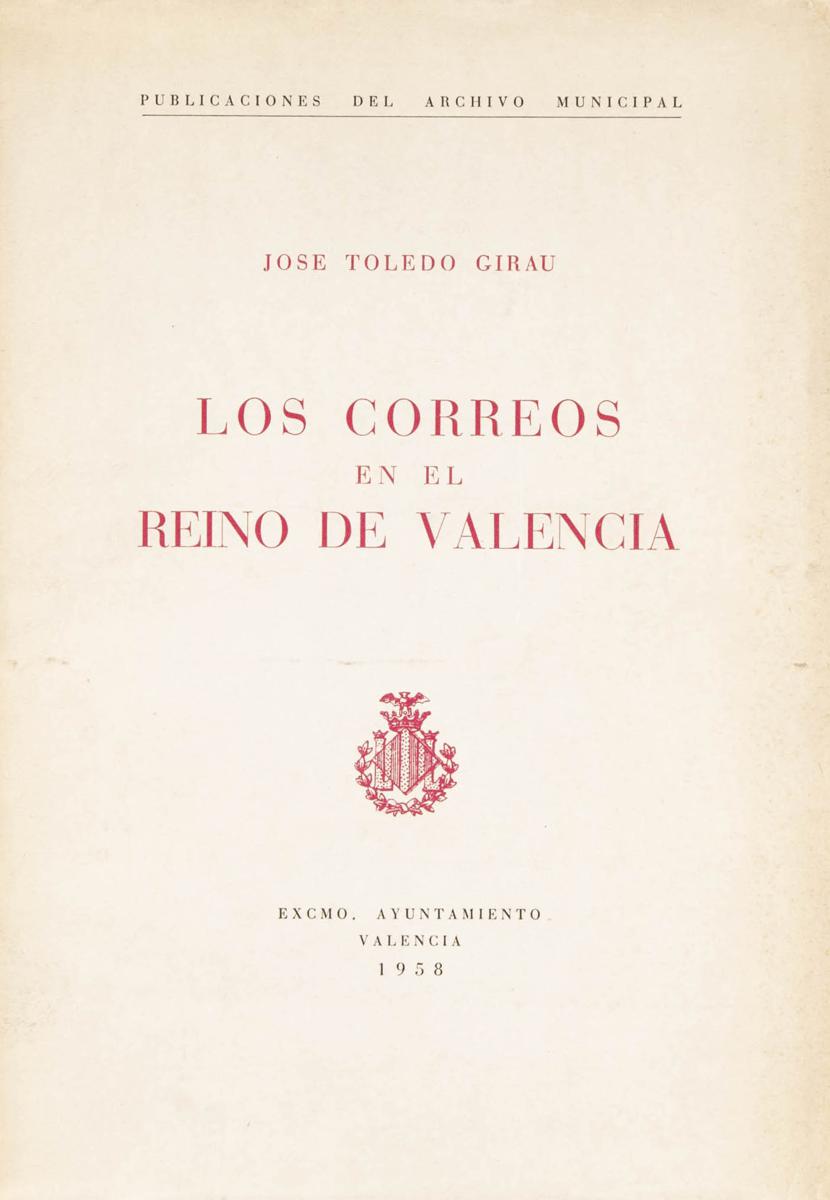 1958. LOS CORREOS EN EL REINO DE VALENCIA. José Toledo Girau. Ayuntamiento de Valencia. Valencia, 1958.