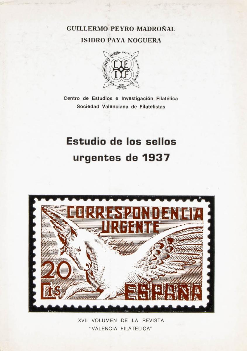 1962. ESTUDIO DE LOS SELLOS URGENTES DE 1937. Guillermo Peyro Madroñal e Isidro Payá Noguera. Valencia Filatélica. Valencia, 1962.