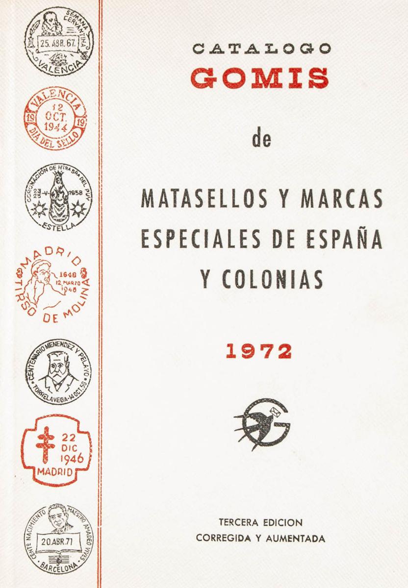 1972. CATALOGO DE MATASELLOS Y MARCAS ESPECIALES DE ESPAÑA Y COLONIAS, 3ª edición. José Mª Gomis Seguí. Valencia Filatélica. Valencia, 1972.