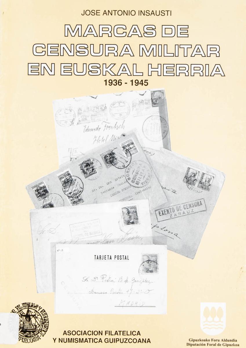 2000. MARCAS DE CENSURA MILITAR EN EUSKAL HERRIA 1936-1945. José Antonio Insausti. Asociación Filatélica y Numismática Guipuzcoana. San Sebastián, 2000.