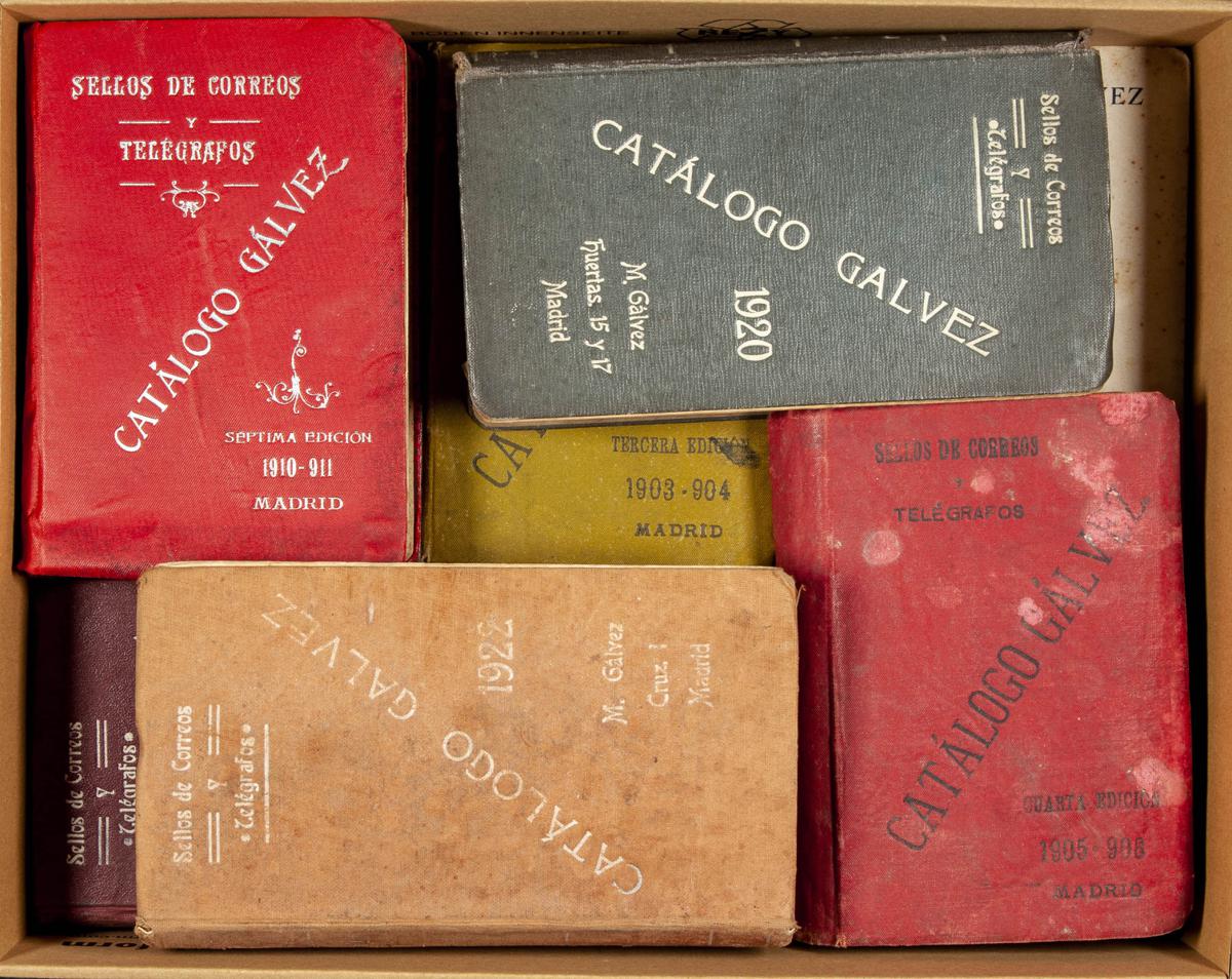 (1900ca). Espectacular y rarísimo conjunto de catálogos MIGUEL GALVEZ: SELLOS DE CORREOS Y TELEGRAFOS DE ESPAÑA, ediciones de 1900-1901 a 1913, 1919, 1920, 1922, 1948 y 1951, ESPAÑA, COLONIAS Y EX-COLONIAS, ediciones de 1896, 1922, 1933, 1943-44, 1947, 1950, 1954 y 1962-63 y PRECIO CORRIENTE DE SELLOS DE ESPAÑA, ediciones de 1953 a 1956. A EXAMINAR.