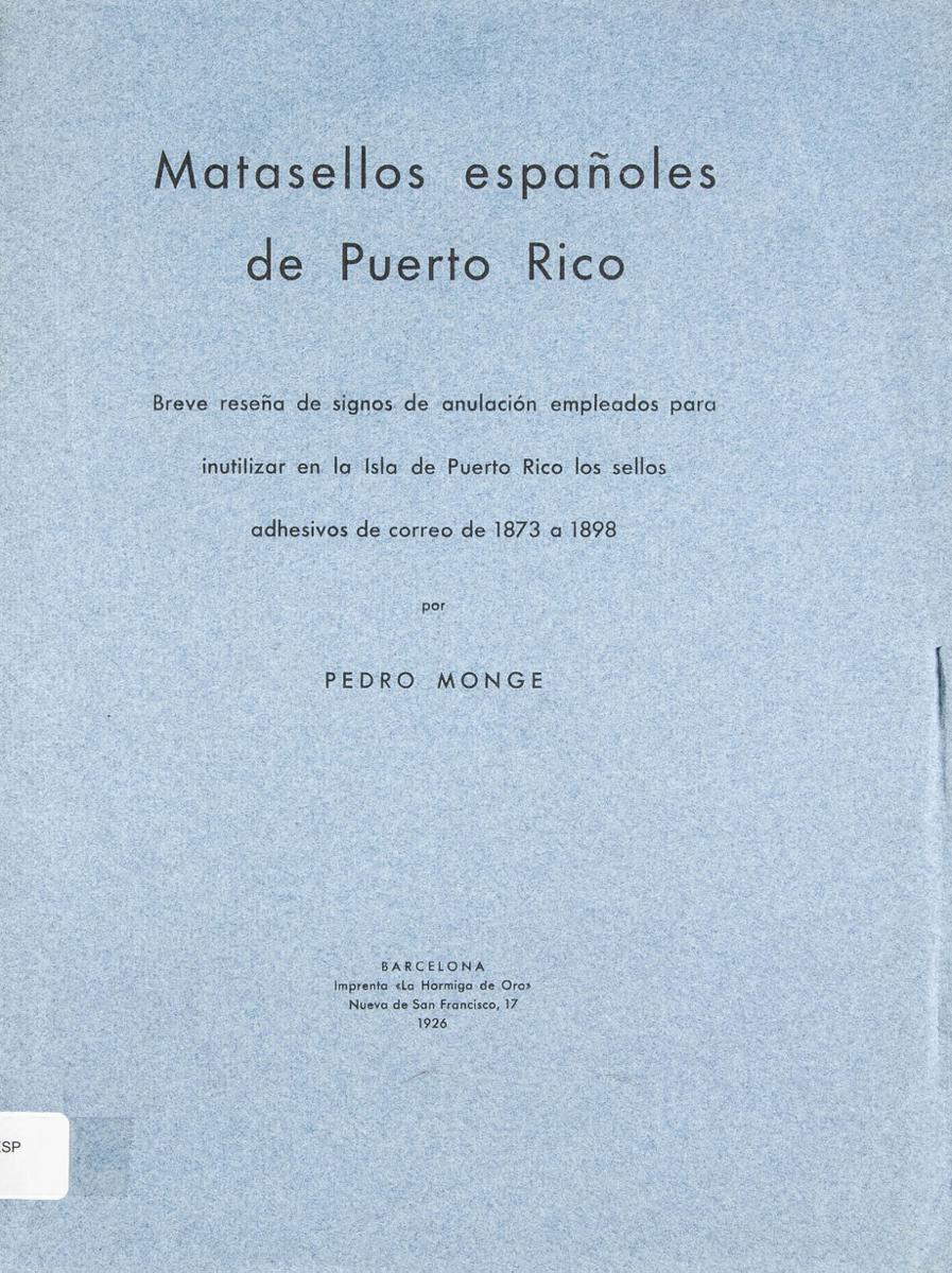 1926. MATASELLOS ESPAÑOLES DE PUERTO RICO, BREVE RESEÑA DE SIGNOS DE ANULACION EMPLEADOS PARA INUTILIZAR EN LA ISLA DE PUERTO RICO LOS SELLOS ADHESIVOS DE CORREO DE 1873 A 1898. Barcelona, 1926.