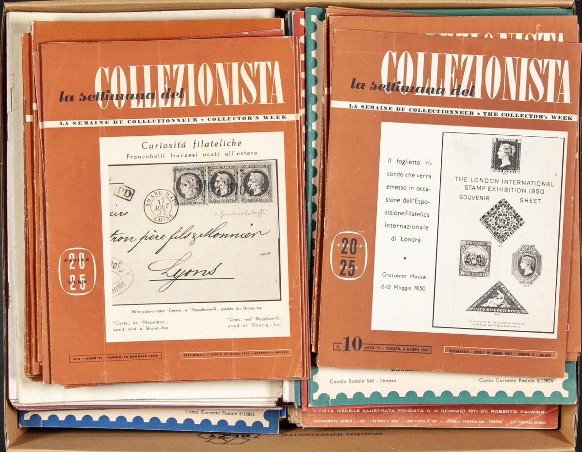 (1950ca). Conjunto de publicaciones italianas: IL BOLLETINO FILATELICO, de los años 1951 a 1960 (Nº471, 743 al 746, 481, 483, 485 al 487, 489, 491 al 502, 505, 506, 509 al 523, 526, 527, 556, 557 y 577), IL COLLEZIONISTA ITALIA FILATELICA, de los años 1950 a 1952 (Nº1 al 12, 17 al 32), LA SETTINATA DEL COLLEZIONISTA de 1950 (Nº1 al 16), LA RIVISTA FILATELICA D´ITALIA, de los años 1940 a 1943 (diversos números), SPORT PHILA de los años 1954 a 1956 (Nº13 al 15, 19, 20, 23 al 27, 29 al 31 y 35 al 40). A EXAMINAR.