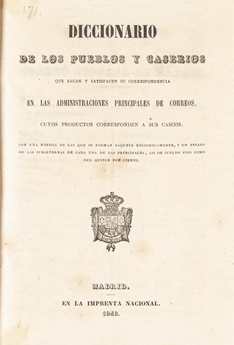1846. DICCIONARIO DE LOS PUEBLOS Y CASERIOS QUE SACAN Y SATISFACEN SU CORRESPONDENCIA EN LAS ADMINISTRACIONES PRINCIPALES DE CORREOS. Imprenta Nacional. Madrid, 1846.