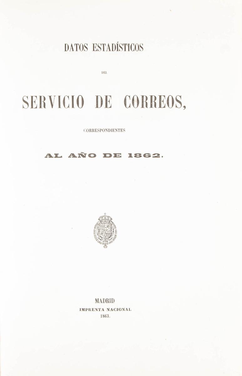 1863. DATOS ESTADISTICOS DEL SERVICIO DE CORREOS CORRESPONDIENTES AL AÑO 1862. Ministerio de la Gobernación, Dirección General de Correos. Madrid, 1863.