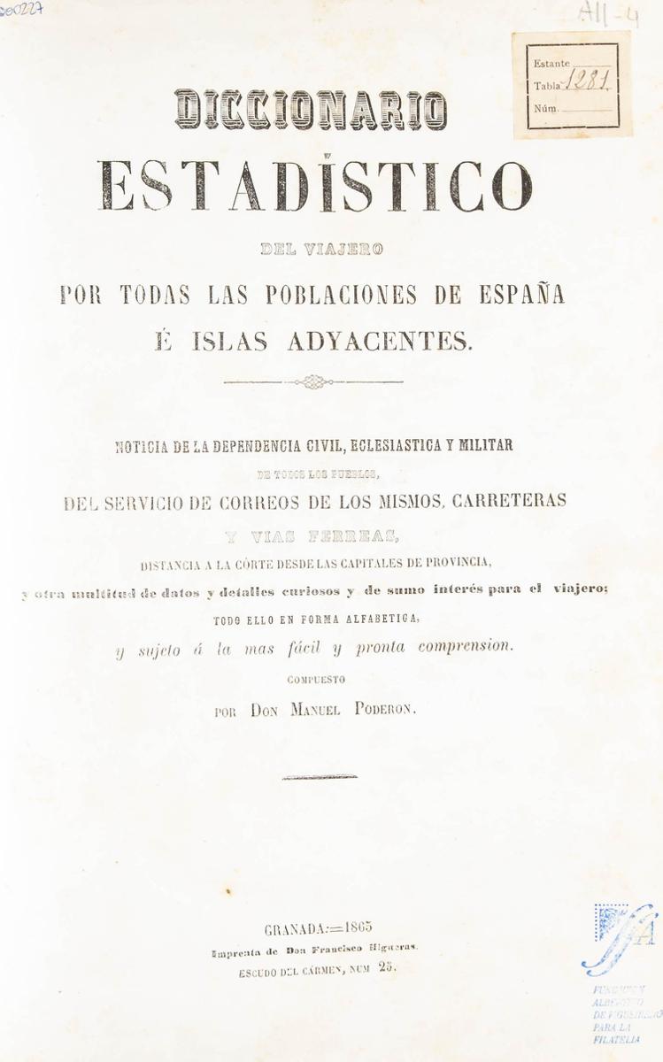 1865. DICCIONARIO ESTADISTICO DEL VIAJERO POR TODAS LAS POBLACIONES DE ESPAÑA E ISLAS ADYACENTES. Manuel Poderón. Granada, 1865.