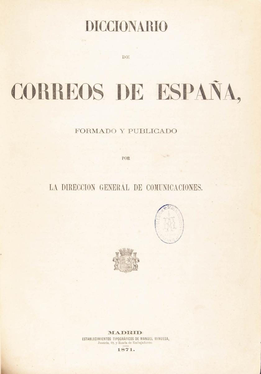 1871. DICCIONARIO DE CORREOS DE ESPAÑA. Dirección General de Comunicaciones. Madrid, 1871.