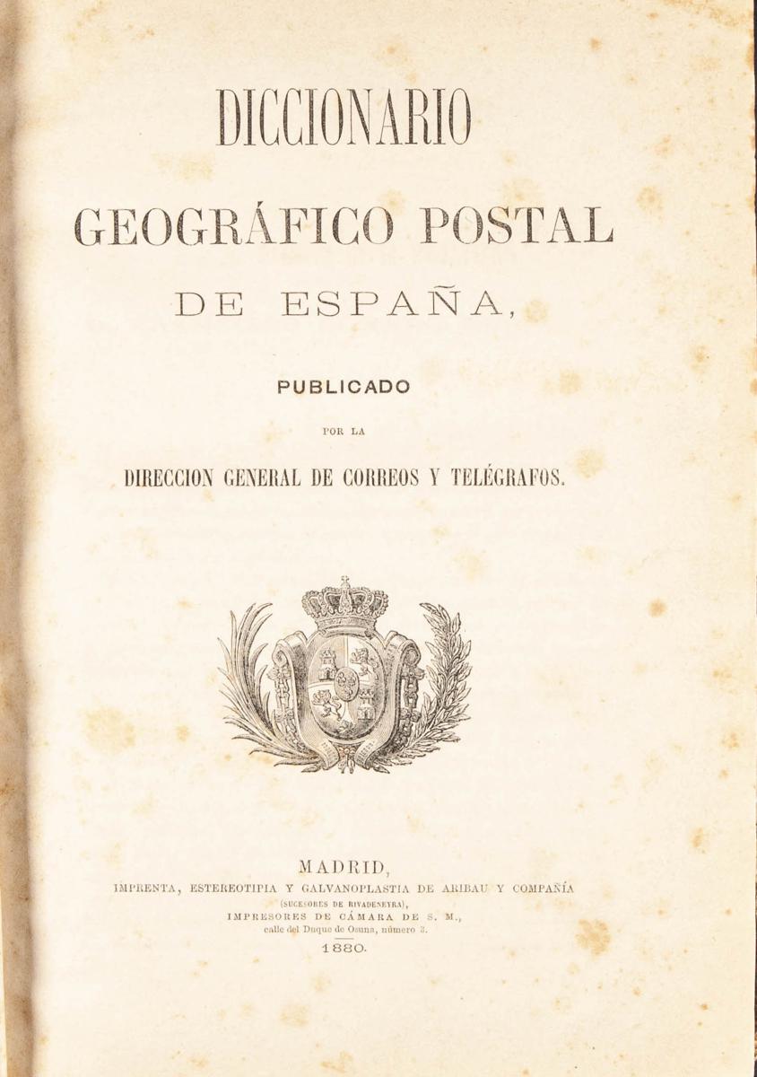 1878. DICCIONARIO GEOGRAFICO POSTAL DE ESPAÑA. Dirección General de Correos y Telégrafos. Madrid, 1880.